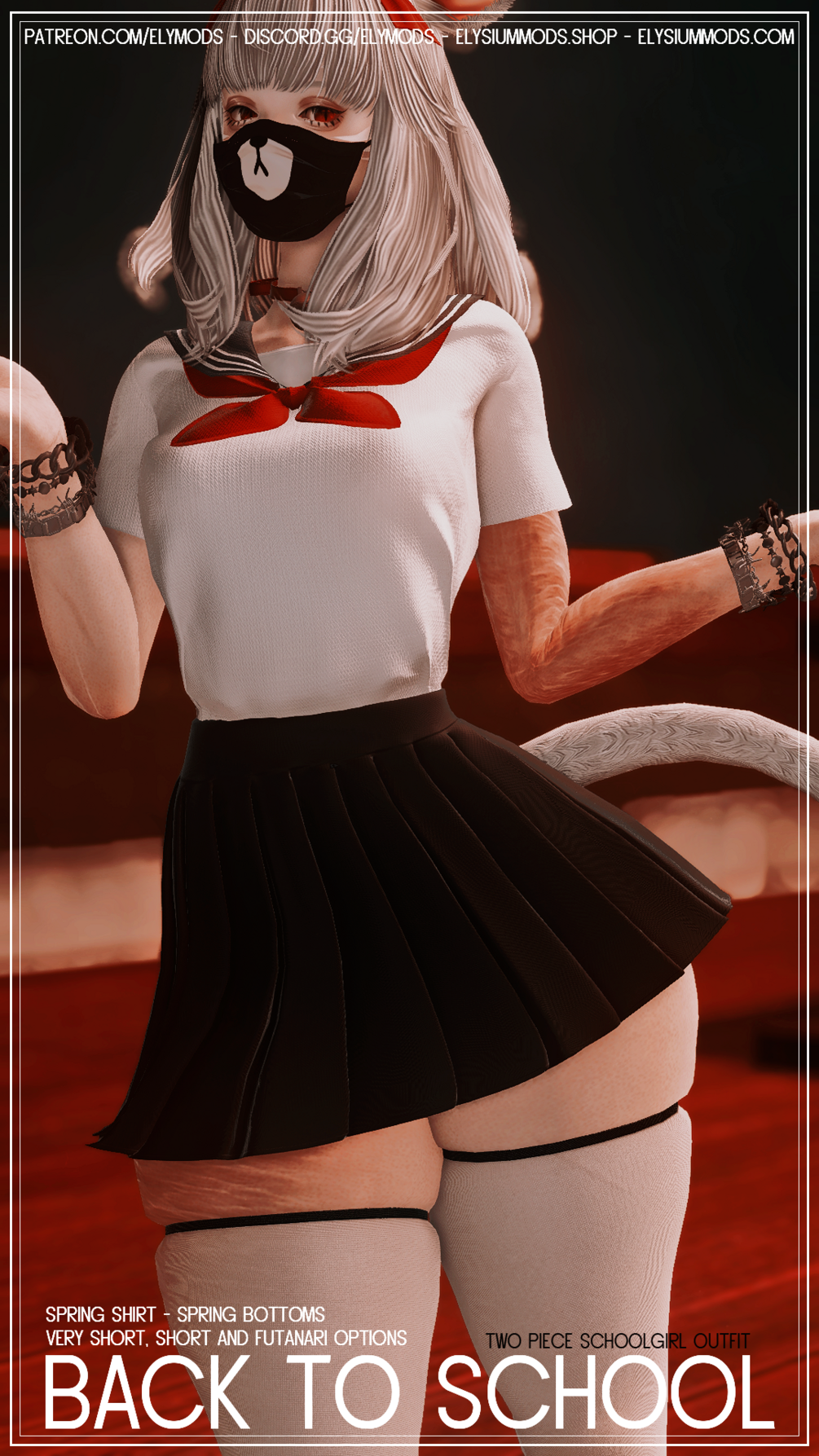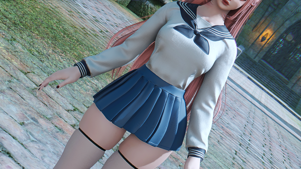A two piece, multi variant schoolgirl set for tall female characters. Comprised of two different top options, two different skirt length options, panties, and thigh-high stockings with generous "squish".